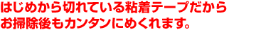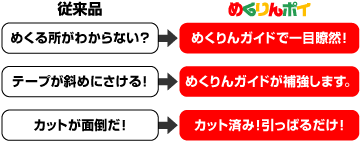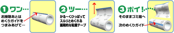 めくりんポイ粘着テープは、お掃除あとのめくりやすさ、使いやすさにこだわり、1枚ずつの重ね巻方式とめくりガイドを付けることで、究極のめくりやすさを実現。つまんで、引っ張って、ゴミ箱へポイ!。これからのやさしい暮らしづくりに役立つ粘着テープです。